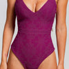 Refined and romantic, the Mulberry Mist One Piece features an over-the-shoulder V-neckline enhanced with crochet accents. Designed with removable cups and moderate coverage, it’s a piece that flatters with artisanal sophistication.